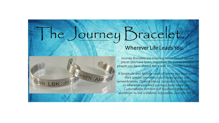 A longitude and latitude mark of where you have spent life’s special moments, your happy places and remembrances. (Special places, occasions, trips, birthdays or wherever your life’s journeys have taken you.) Customizable comfort cuff brushed lightweight aluminum to last a lifetime. Adjustable, one size fits all.